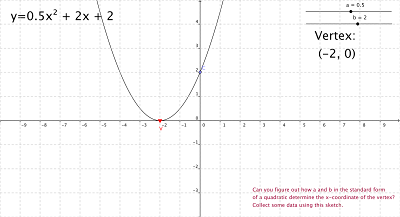 This sketch helps you investigate the location of the vertex for a parabola in standard form, y=ax^2+bx+c. Since the equation will tell us y if we know x, we will concentrate on the x-coordinate of the vertex.